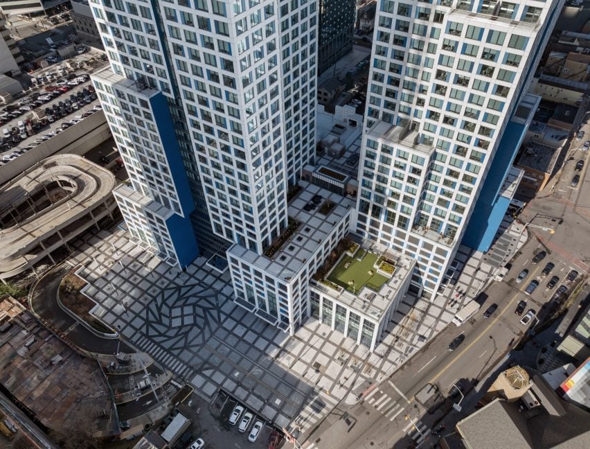 在底部,工作室设计了每座塔楼“与地面轻轻连接”,以创建直接连接到建筑大厅的开放式公共广场。