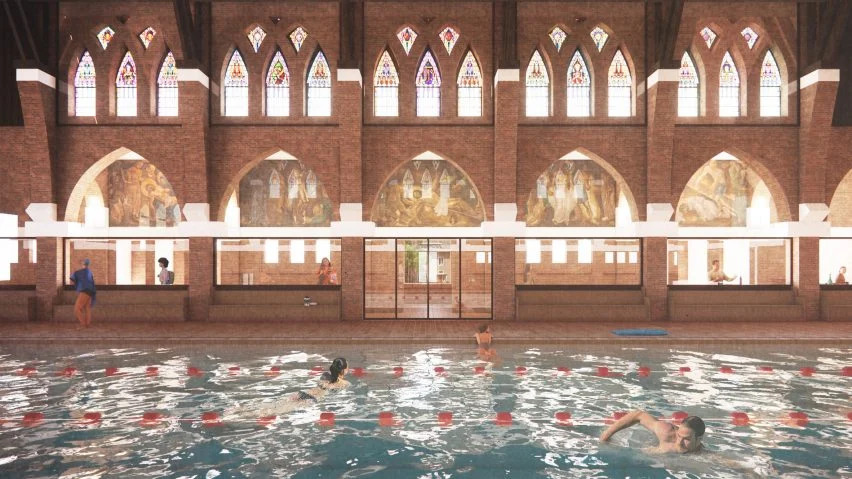 教堂的长椅将被重新用作游泳池周围游泳者的座位和咖啡馆的酒吧桌,而曾经布道的讲坛将成为救生员的座位。