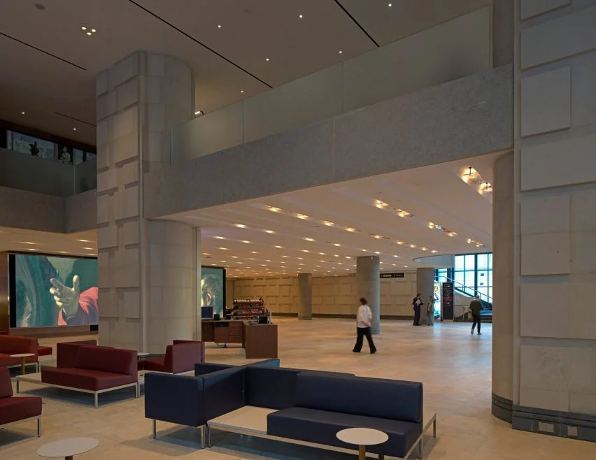 在地下一层,塞尔多夫工作室通过更换地毯、座椅内饰和灯光来更新剧院。这层楼的公共厕所被搬到了其他地方,以增加剧院等候区的面积。