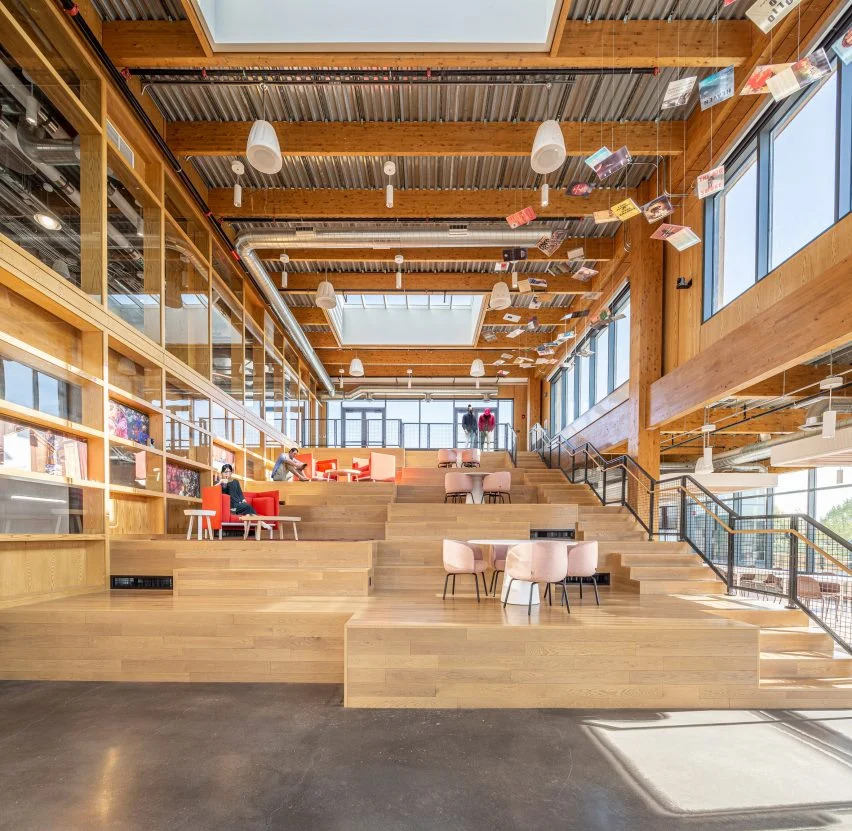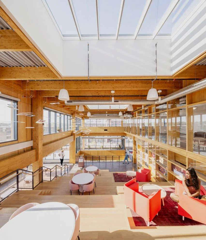 建筑的中心是一个木制的“社区楼梯”,人们可以在那里闲逛和交流。头顶上,一个巨大的天窗引入了自然光。