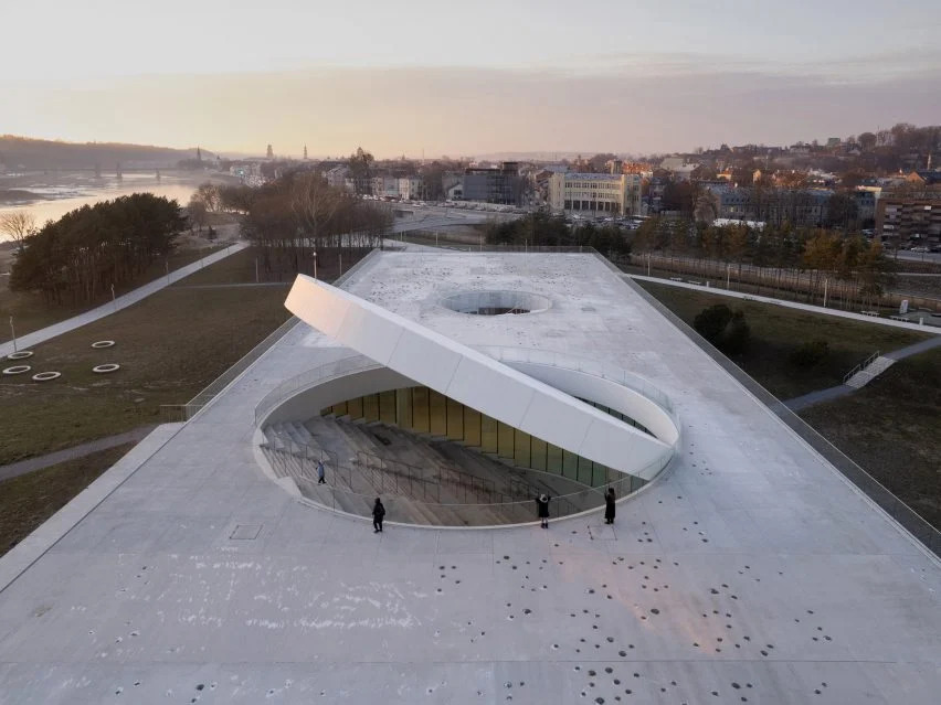 一个闪亮的铝盘将这座由澳大利亚斯马建筑工作室(SMAR Architecture Studio )设计的科学博物馆的屋顶变成了立陶宛第二大城市的“新太阳”。