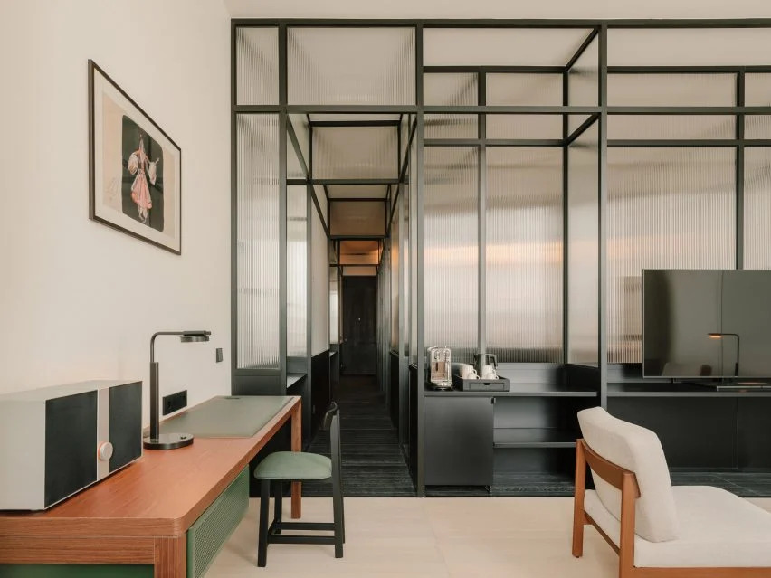与这一理念相一致的是,庭院和周边大道的材料色调保持了户外的气息,所有地板和酒店的接待台都铺上了石灰华瓷砖,旁边是非正式的长凳座位,让人想起街头家具。