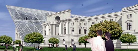 VB:所以,从您的学生时代到现在,绘画有一种真正的连续性。您的项目倾向于“逃避”条理,但它们不混乱。您说:“您不能计划混乱,但您能收集它的踪迹。”您的建筑是集合踪迹。有数据、象征、记叙、传说、梦想、神话的踪迹。您能举些有关您的最近的项目的来源和想法的例子吗?例如多伦多的皇家安大略博物馆(Royal Ontario Museum)。