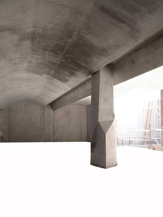 混凝土的力度在议会大楼工程中完善了建筑设计对动感和力量的追求,不过混凝土在表达力度的同时也带来了设计和施工的问题,需要更多的设计投入。比如上面提到的Canongate围墙的预制混凝土,上下两曲面在早期设计中是圆锥的一部分。然而这样每块预制件的半径都会不同,也就意味着每块混凝土预制件的模板都不一样。预制混凝土的造价主要集中在模板上,能否能尽量多的重复使用同一模板非常重要的。我们认为原设计的圆锥曲面可以改成圆柱曲面,只需要将上下两端进行变化制造视错觉,也可以达到原设计的动态效果。这样修改后各预制件的曲面半径是不变的,于是可重复使用一套模板,节约了15倍的造价。议会大楼的混凝土带来了许多施工方面的挑战等,有些可在设计上解决,有些则需要先进技术的支持,后一个问题将在后面的文字中继续讨论。