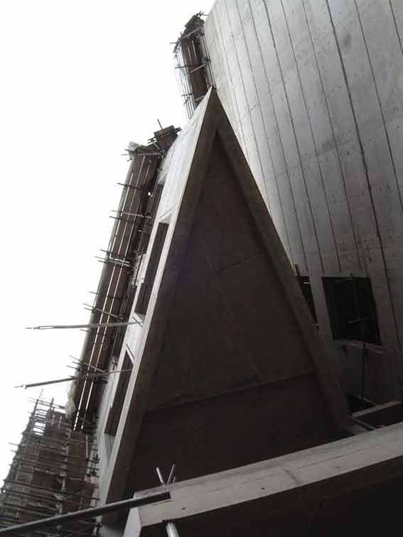 议会大楼中带竹子纹理的混凝土使用的是木模板,由于构件都比较大,超过了标准木模板的尺寸,只好进行拼接,施工队在模板内侧均匀地涂了一层胶防止拼缝留痕。然而由于在浇混凝土时还要震荡,这层胶出现了裂纹,结果还是在混凝土的表面留下了一条深色的痕。由于构件的表面有竹子的纹理,要求不能有缝,施工队后来加固了模板的拼接解决了这个问题。(如图15)