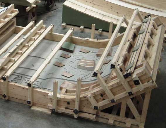 其中首层部分混凝土的凹凸处理分为两种。一种是带竹子图案的平面混凝土板(如图10,11)。关于如何在混凝土面上展示竹子图案我们还尝试过化学腐蚀的方法(类似赫尔佐格设计的Ebersnwalde图书馆) ,最后觉得装饰味太浓,跟总体设计不和谐而决定作混凝土的凹凸。为了制造带竹子图案的模板,施工单位购置了一台能读取CAD三维模型的机器人。开始竹子的设计图案是内凹的,后来改作外凸的,因为这样模具的制作可以节省5倍以上的时间和造价;另一种凹凸处理是在北面沿canongate街的一段形体复杂的混凝土墙,其表面上刻有米拉勒斯的草图和其他一些类似地形等分线般的图案(如图12,13,14)。由于目前模具机器人技术只能制作平面的模板,我们的解决方法是先用机器人制作个平面的正模板,然后用这个平面的模板浇个橡胶负模板。因为橡胶模板可以弯曲,最后再把这个橡胶模板压到曲面混凝土板的结构模板里。