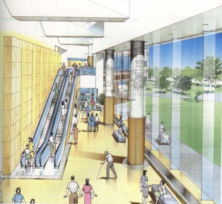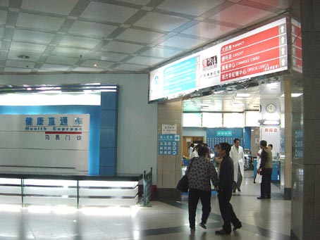 在笔者于97年设计2001年竣工的“广东省人民医院”门诊住院大楼中,(图3)采用了广州传统的骑楼式医院街,这是一例典型的外向型医院街。首先,该大楼首层沿街面全部架空并朝城市街道开放,沿中山二路和东川路展开,以轻松的灰空间融入城市街道的人行空间,所有医疗功能均经架空层的自动扶梯引向二层,首层看不到就医状况,只留医院院史展示区、宣教咨询区、预约中心、等候厅、电梯厅,以及便利店、医药保健品商店、鲜花店、配镜中心等特色商业功能。在长达300米的医院临街面走过,行人可随时进入骑楼中的商店,也可由商店直接进入医院门厅,不仅为城市退让出舒适的空间界面,显示出公共建筑的公共性,为医院带来极为可观的经济收入,同时消除了医院给人的恐惧感,展示出医院的大众服务,营造健康的本质。开放的咨询大厅也为医院带来了更多的患者,增加了就诊的便利性。(图4~9)此外医院街入口内与二层门诊以自动扶梯相通(图10)、外与城市地铁接驳(图11),进出都极为方便。
