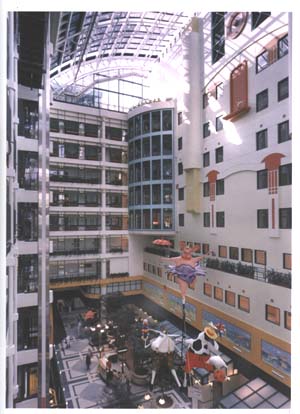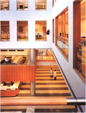 新建医院的共享大厅应明亮、宽敞、宁静,使患者感到安宁、平和。笔者早在1991年设计的深圳市人民医院门诊住院综合大楼时就这把共享大厅组织在主干线上,以疏导、缓解人流压力,又要把人群聚集、滞留的场所如挂号厅、取药厅安排在共享大厅周围,相对独立,空间上又相互渗透,使观者见到的不是如海如潮的人流,而是一个亲切、宁静、充满阳光的空间。(图16)