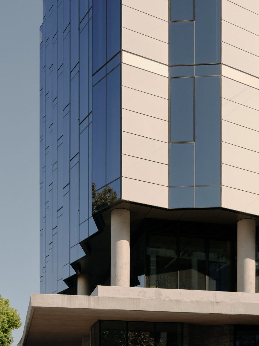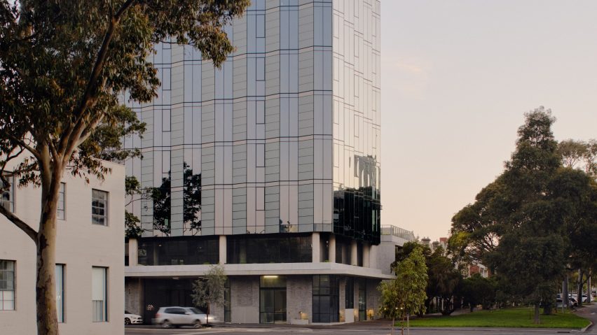 这座办公楼位于墨尔本,由砖砌底座上的褶皱玻璃立面构成。