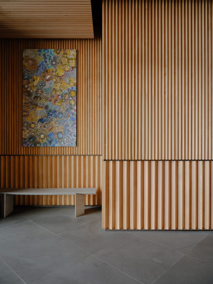 这一策略旨在在建筑内创造一个舒适的环境,装饰细节包括瓷砖地板和褶皱的木墙,让人联想到立面。