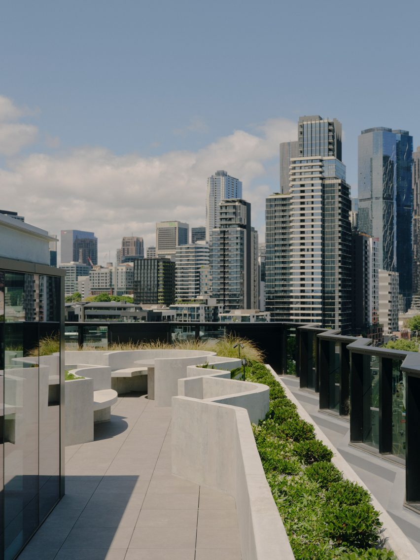 屋顶花园位于建筑顶部,设有被植被包裹的内置座位空间。