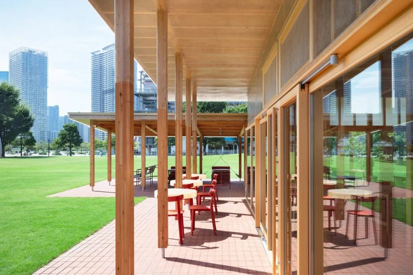 这座木制建筑由三个不同高度的斜屋顶组成,旨在与东京湾(Tokyo Bay.)旁的东京丰洲公园的树木融为一体。
