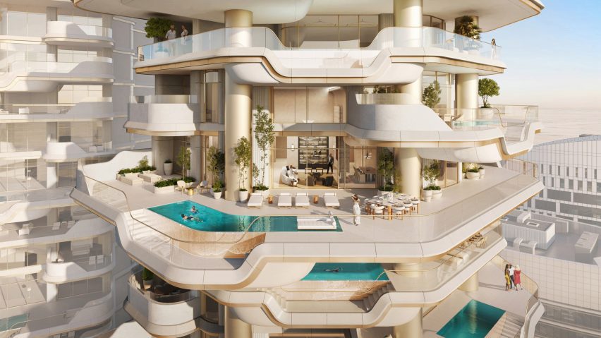 这些公寓将在交错的室外露台上设有私人游泳池,这些露台将围绕建筑立面旋转,给人一种瀑布般的水的感觉。
