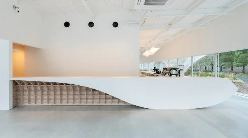 游客从街上通过人行道进入,进入一个极简主义的室内,一个白色抛光柜台延伸到整个空间。