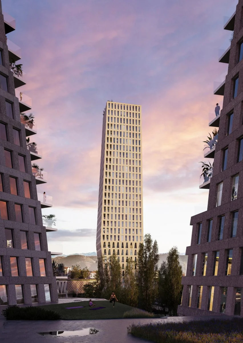 大都会工作室在周边开发项目中的高层建筑将采用石材包裹的棱角形,以阿尔巴尼亚的山地景观和该国公元前3世纪历史悠久的阿曼蒂亚体育场(Amantia)为灵感。