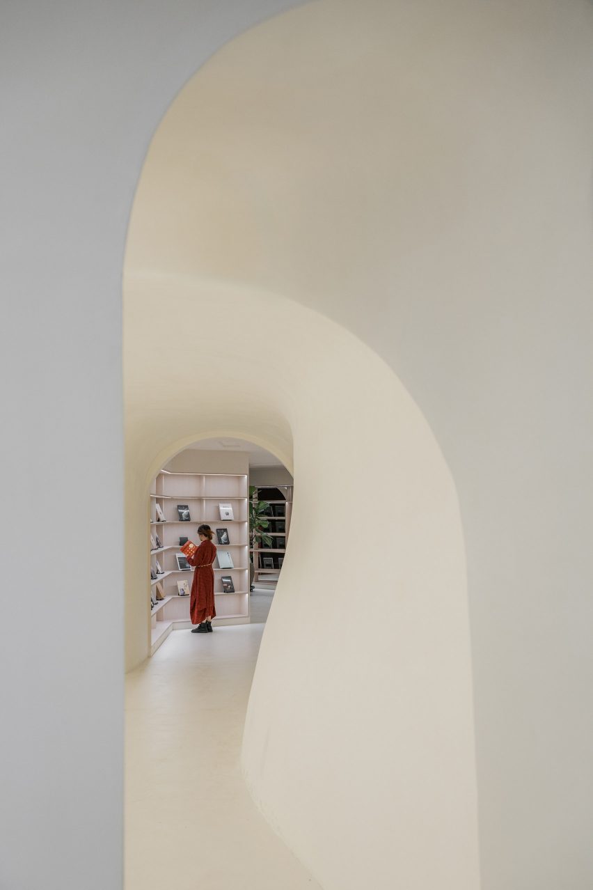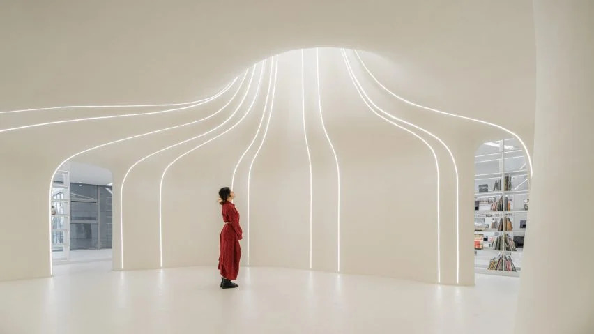 光滑弯曲的墙壁和喷口状的天窗旨在唤起人们对中国陶瓷页书店(Ceramic Pages,)茶壶状内部的回忆,这是当地建筑工作室乌托邦实验室(Wutopia Lab)在中国设计的一家书店。