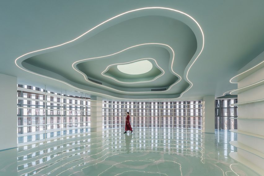 陶瓷页面书店(Ceramic Pages)的顶层包含一个圆柱形画廊和休息区。它以光滑的地板和带有波纹切口和反光区域的天花板为装饰,旨在唤起人们对水的向往。